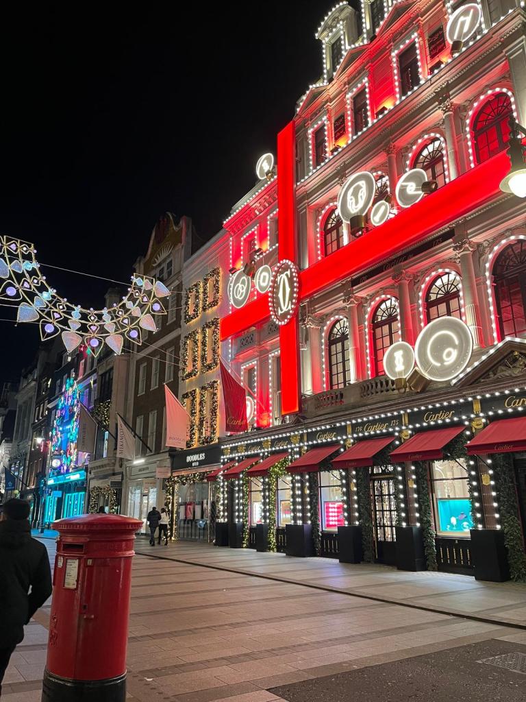 Wenn London in Weihnachtsstimmung ist, führt an der Regent Street kein Weg vorbei! Die riesigen, beleuchteten Engelsfiguren, die sich über die Straße spannen, sind einfach nur magisch – jedes Jahr ein absolutes Highlight. Und das Beste: Wenn man einmal dort ist, kann man direkt drumherum alles mitnehmen, denn auch die angrenzenden Straßen wie Oxford Street, Carnaby Street oder New Bond Street sind weihnachtlich dekoriert und eignen sich perfekt zum Bummeln.