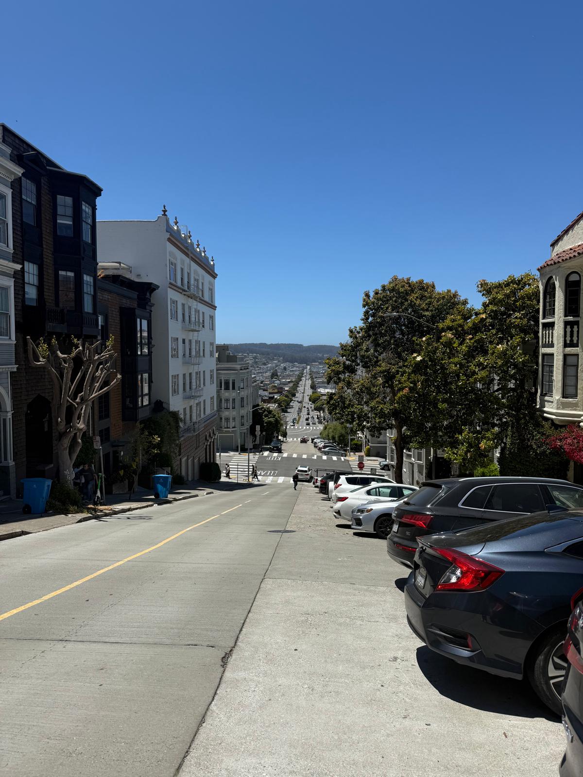 Danach ging es zu Fuß über die Lombard Street Richtung Pier 39. Unser Hotel lag direkt in der Lombard Street, also haben wir uns einfach zu Fuß aufgemacht. Und ja… San Francisco ist hügelig. Ich wusste das vorher, aber die Steigungen haben es echt in sich! Die berühmten Kurven der Lombard Street kennt jeder von Bildern, aber wenn man dann mittendrin steht, verliert das Ganze ein bisschen den Wow-Faktor – trotzdem ein Muss, wenn man in der Stadt ist.