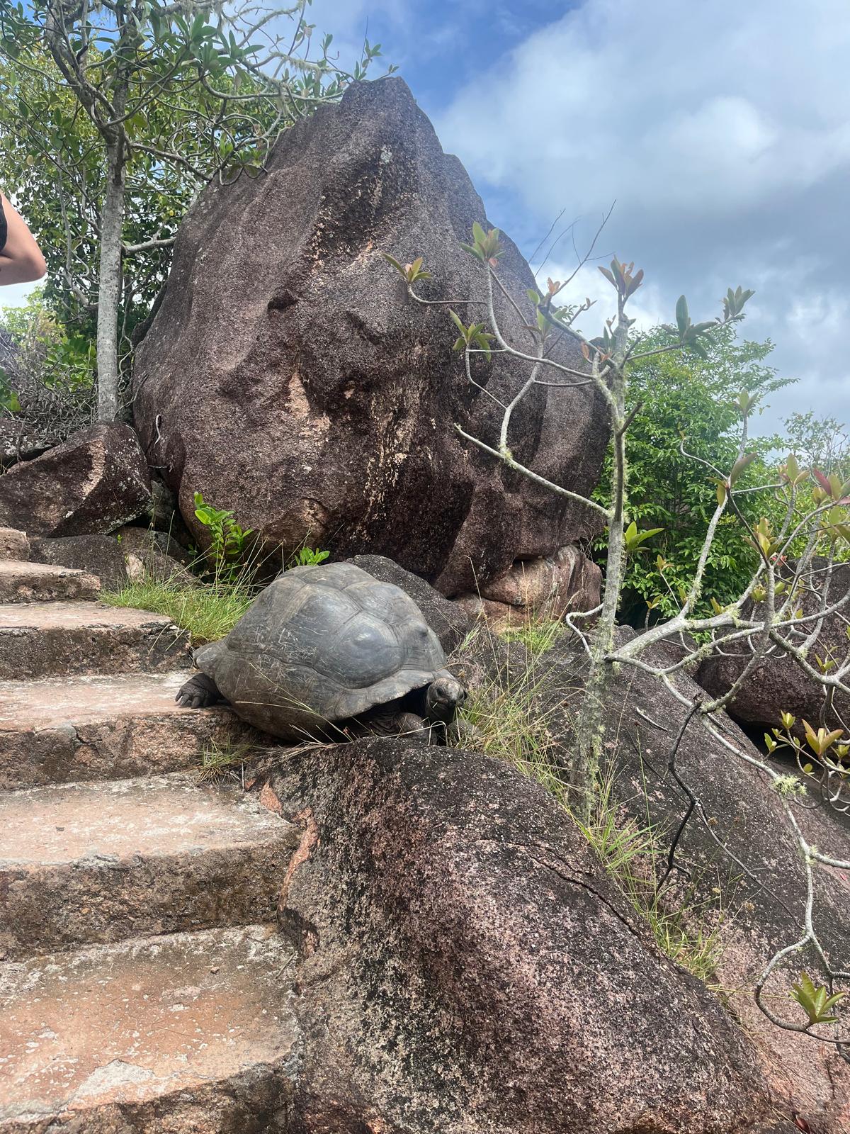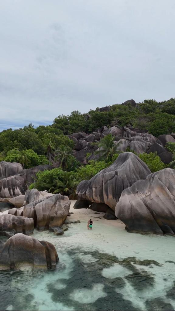 Ein riesiger Felsen an der Küste, der aussieht wie eine Schildkröte, die ins Wasser springt! So eine verrückte Formation sieht man nicht alle Tage – die Natur auf den Seychellen ist wirklich der Wahnsinn!