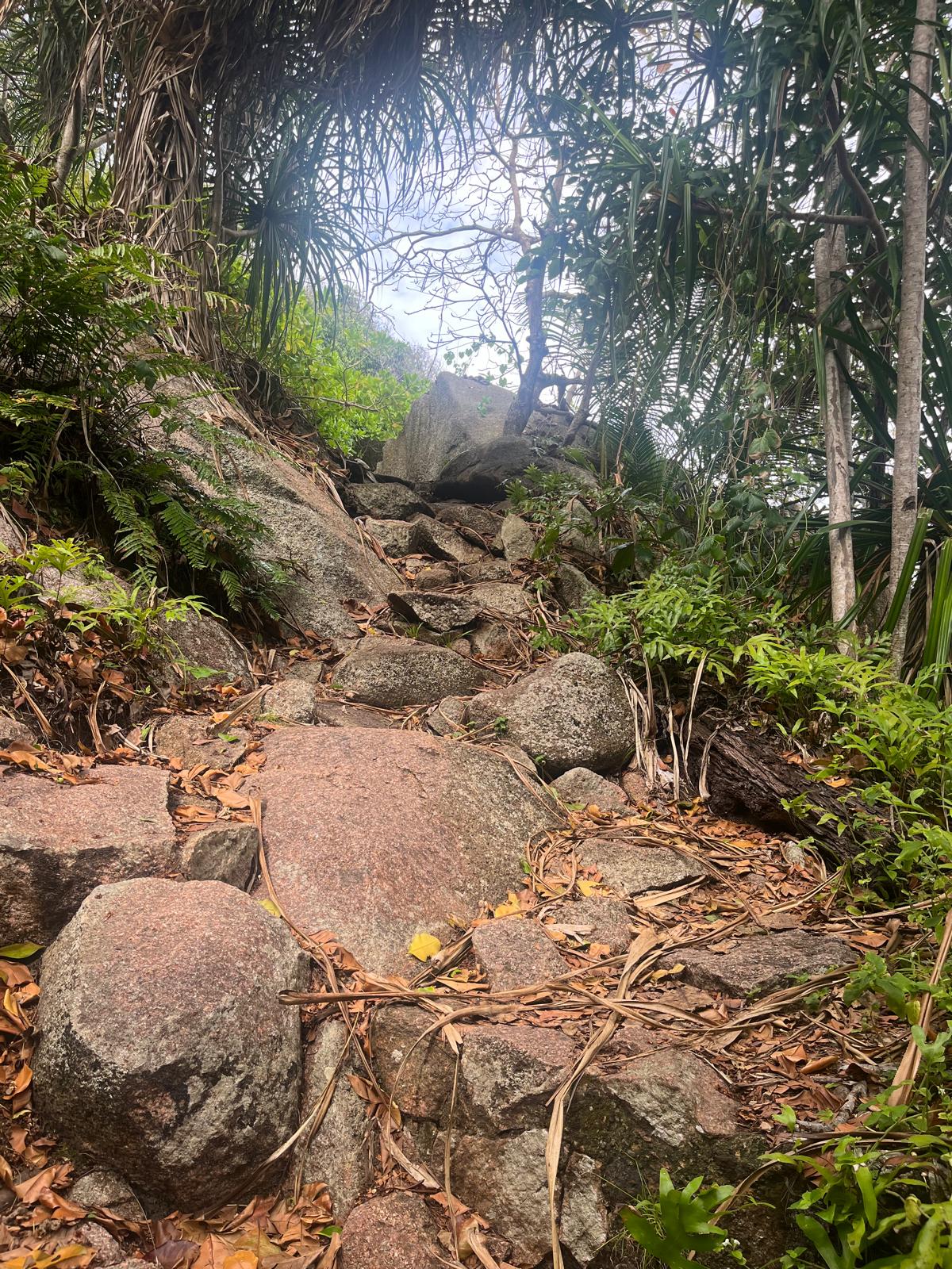 Vom Grande Anse aus startet der Weg zu den Natural Swimming Pools, aber – ganz ehrlich – der Einstieg ist nicht wirklich ausgeschildert. Wanderweg? Eher ein schmaler Trampelpfad zwischen Felsen und Palmen. Wir haben eine ganze Weile gebraucht, bis wir überhaupt gecheckt haben, wo es losgeht. Also: Augen offen halten und einfach immer nach rechts ans Ende des Strandes. Ich versuche euch mit Bildern mal den Weg etwas darzulegen. Vom Grande Anse Beach müsst ihr erstmal der Beschilderung zum Petite Anse Beach folgen. Wir sind hier wirklich gebückt unter Palmen durchgelaufen, nie im Leben haben wir gedacht wir sind auf dem richtigen Weg… Wenn es sich also falsch anfühlt, seid ihr wahrscheinlich richtig!