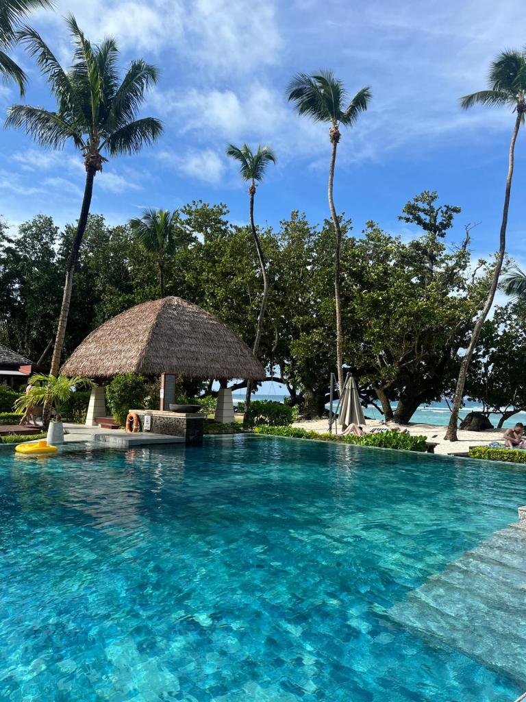 Nach ca. 24 Stunden auf den Beinen kamen wir endlich an. Empfangen mit Gesang, kleinen Golfcarts die zur Abholung bereit standen und bester Laune. Wir sind durch das Resort gefahren und haben einmal alles gezeigt bekommen. Dann wurden wir an unserem Bungalow rausgelassen: Unser Bungalow war NICHT in erster Reihe am Strand, sondern mitten im Resort. Meine Stimmung: Auf 180!