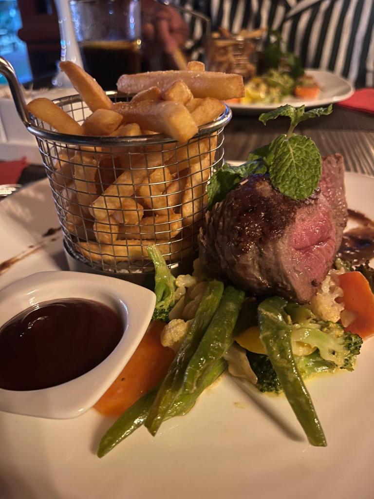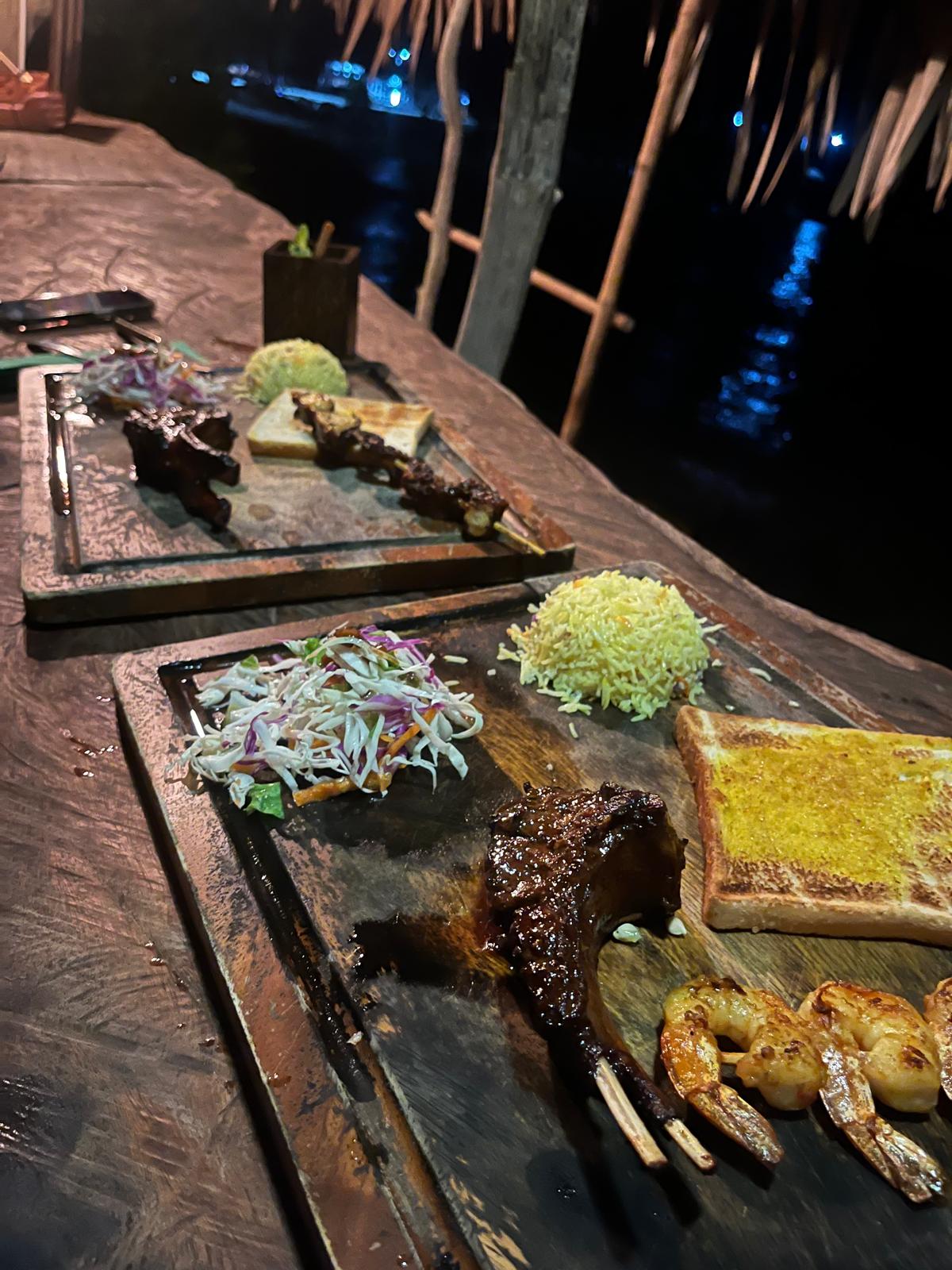 Was das Essen angeht: Es gab eine riesige Grillplatte mit einer genialen Kombination aus Fleisch und Meeresfrüchten – alles direkt vom Grill. Dazu gab es Beilagen wie gegrilltes Gemüse, Reis und ein paar leckere Dips.
