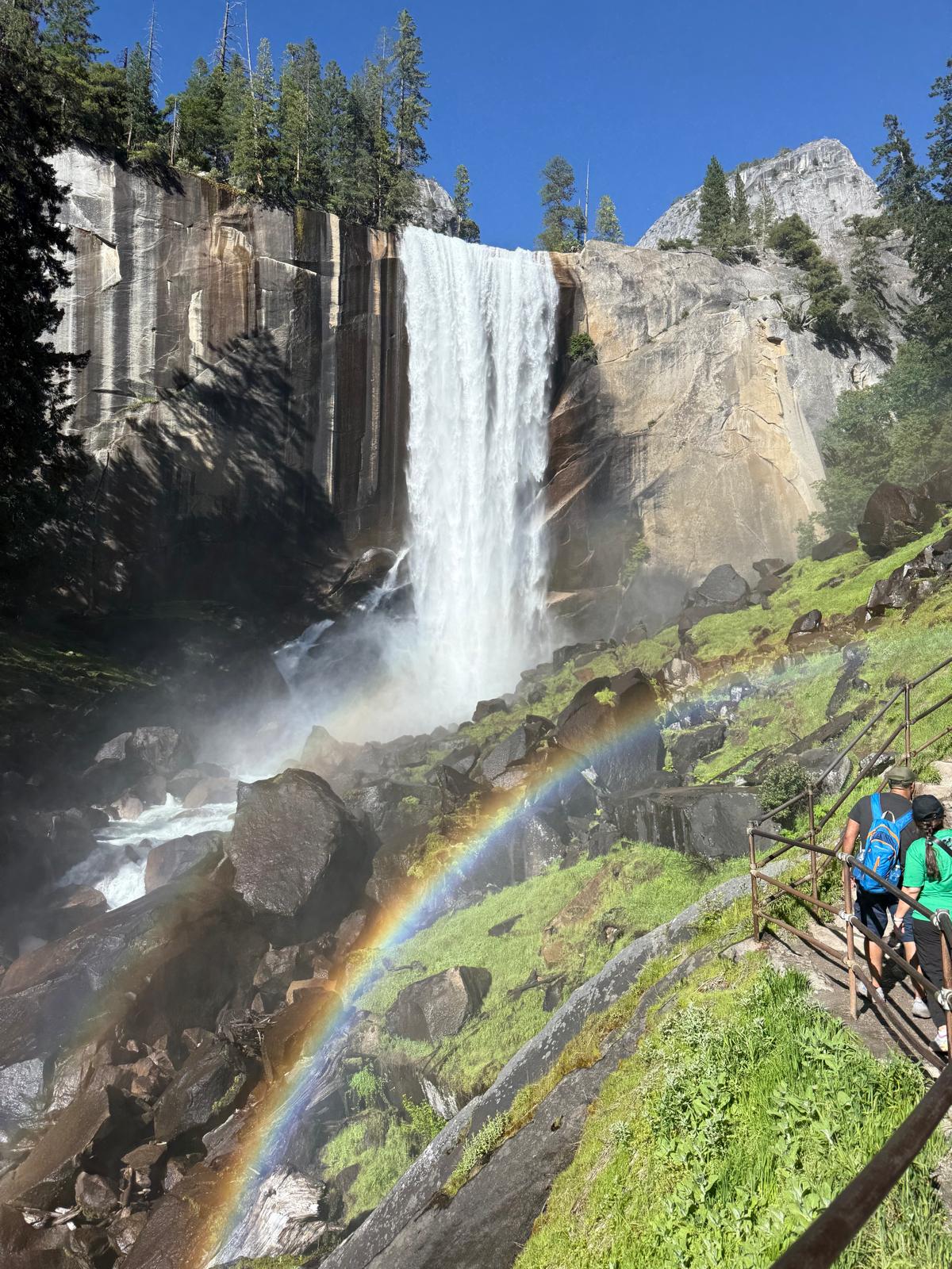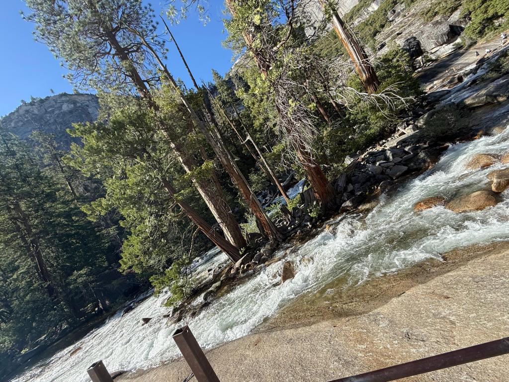 Als wir dann endlich rein konnten, blieb uns leider nur noch Zeit für eine Wanderung. Die fiel dafür umso schöner aus: der Mist Trail zu den Vernal und Nevada Falls. Klingt harmlos, hatte es aber ordentlich in sich. Steile Stufen, viele Höhenmeter, und an den Wasserfällen wird man fein eingenebelt – daher auch der Name. Es war anstrengend, aber die Aussicht auf die tosenden Wassermassen hat alles wieder wettgemacht.