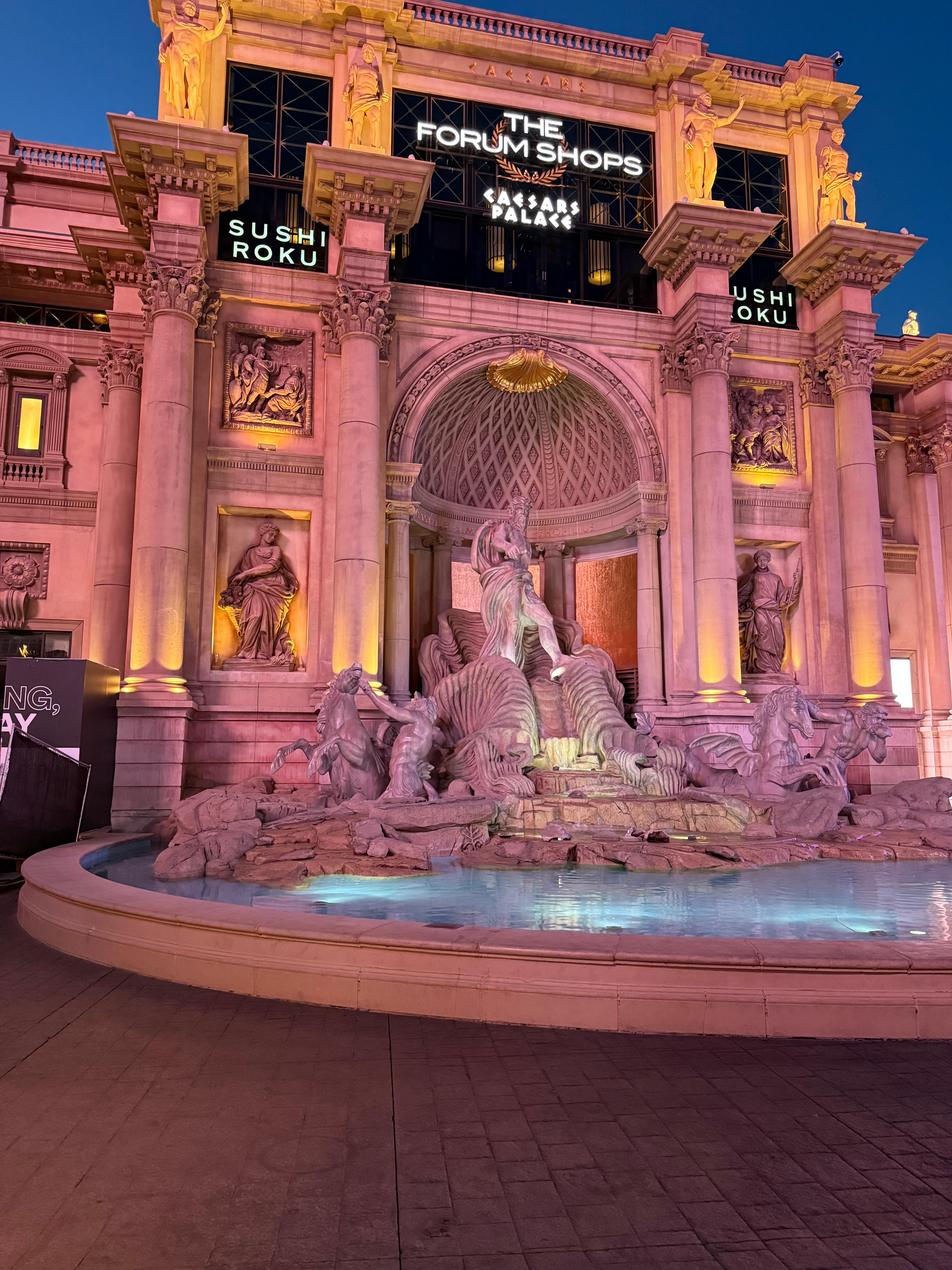 Von dort ging’s ins Caesars Palace – und hier fühlt man sich wirklich wie im alten Rom. Riesige Marmorsäulen, Statuen, goldene Ornamente und Deckenmalereien, als würde man in einer Kathedrale stehen. Dazu ein Shoppingbereich mit künstlichem Himmel, der ständig seine Lichtstimmung ändert. Es war richtig voll, aber trotzdem so beeindruckend, dass man gar nicht wusste, wo man zuerst hingucken soll.