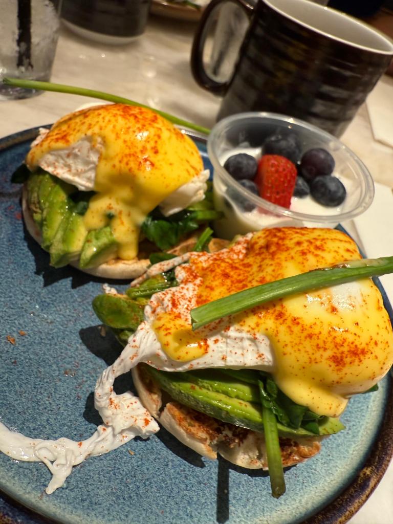 Unser erstes Frühstück gab’s im Chin Chin, dem New York Hotel. Wir sind einfach mal durch die Straßen geschlendert und dachten: Irgendwas finden wir hier bestimmt. Und tatsächlich, wir wurden fündig! Dort gab es für ca. 28 $ pro Person ein großes Frühstücks-Buffet. Das Buffet war super vielfältig: Pancakes, verschiedene Brote, Obst, aber auch Sushi – ja, wirklich! Und dazu konnte man noch etwas von der Karte bestellen. Wir hatten zum Beispiel Eggs Benedict dazu, total lecker!